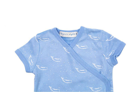 Organic Cotton Summer Crossover Sleepsuit With Legs - Tiny Whales in Blue
