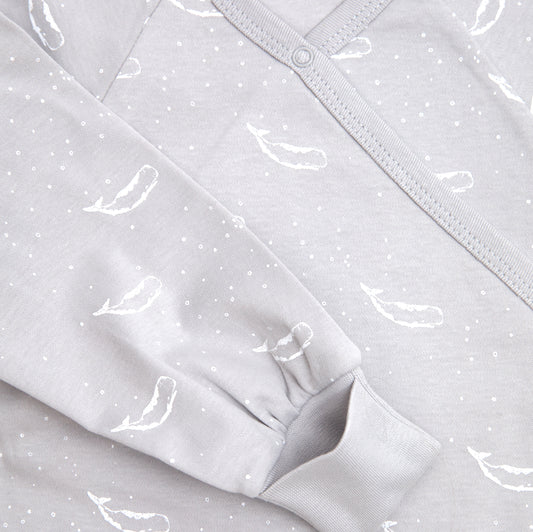 Organic Cotton Crossover Baby Onesie Sleepsuit with Feet in Grey Tiny Whales